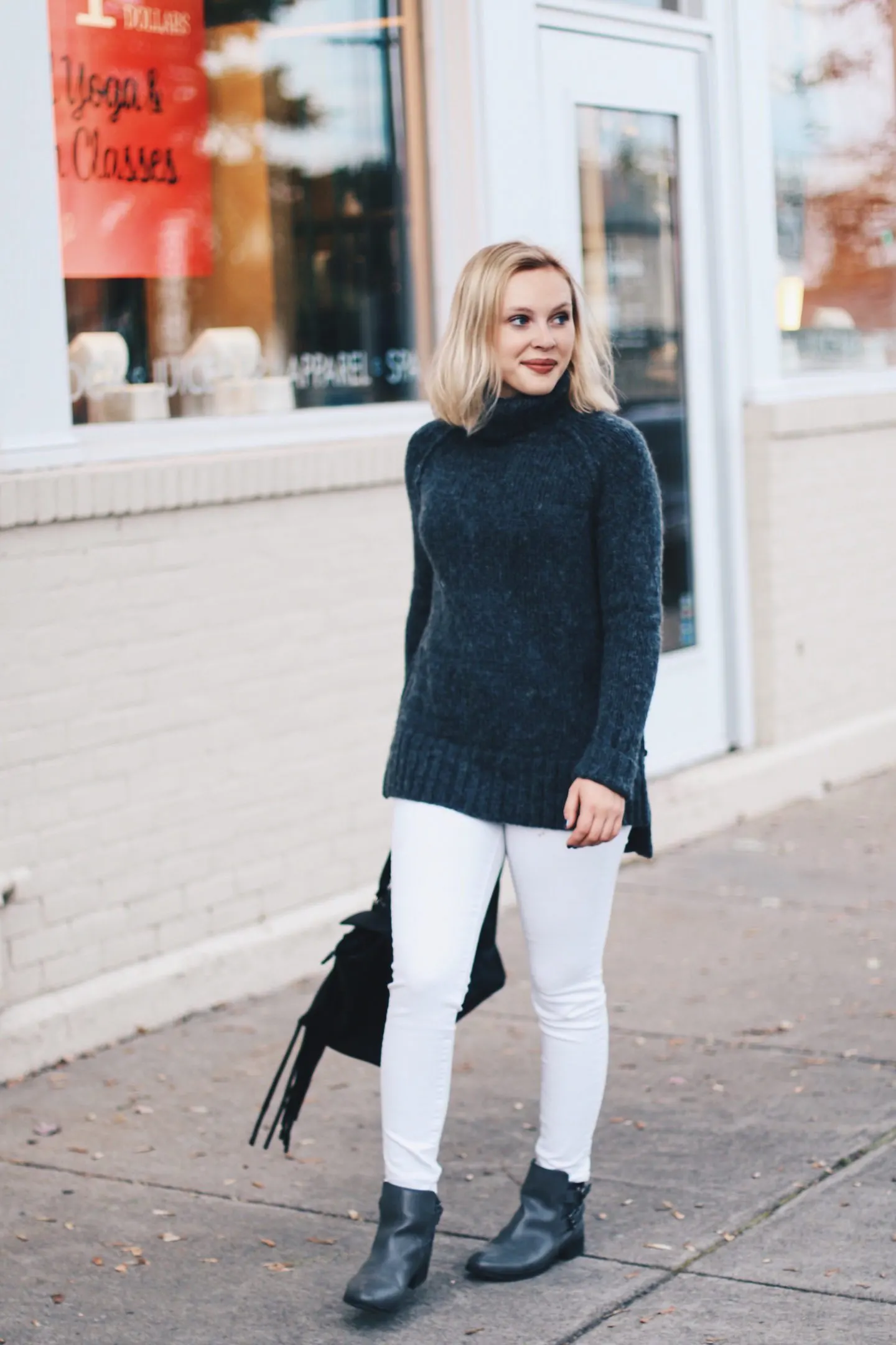 Like I said above, I don’t invest a lot of money into statement sweaters. I’m more about the timeless pieces that I can wear for a long time to come. Though I encourage you to go for some bolder pieces if that’s your style, if you’re like me I recommend focusing on incorporating different textures into your look. Even though I find wool to be a bit scratchy (I had to wash the sweater in these photos SO many times until it actually became cozy), I love texture. You can also add in things like denim and/or faux leather accessories to make things really interesting. Though I enjoy statement pieces from time to time, I don’t believe you need a huge pop of color to create an interesting look. You’ve got options, girl!